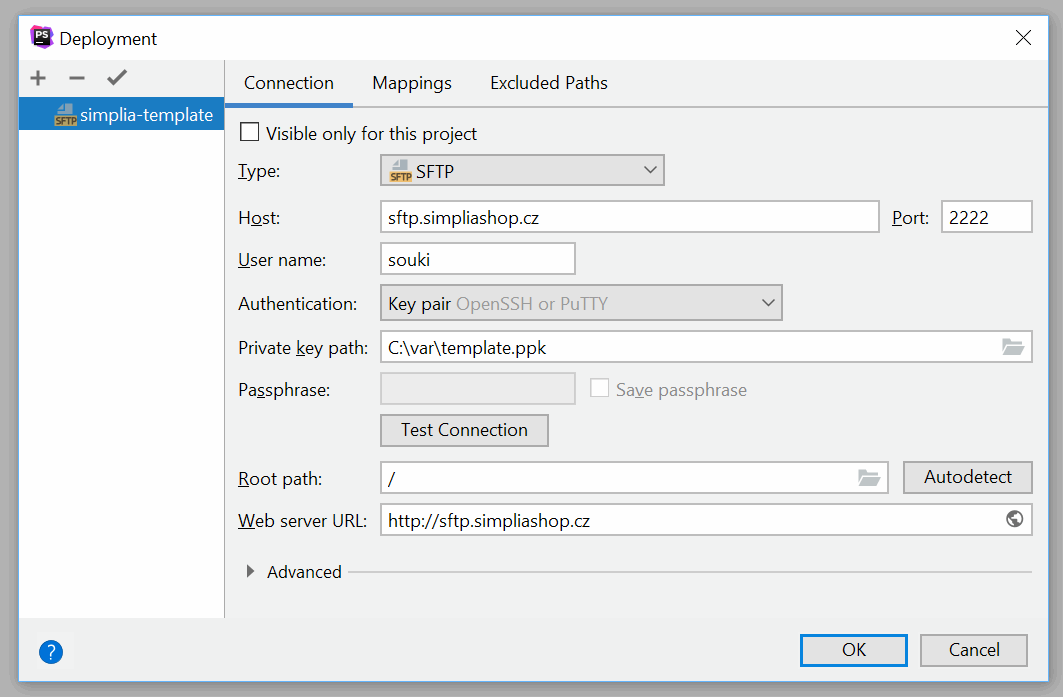 Add a new SFTP server named simplia-template (the name matters so that project presets work correctly when using multiple templates). The server address is sftp.simpliashop.cz, port 2222, and your login was provided by support.